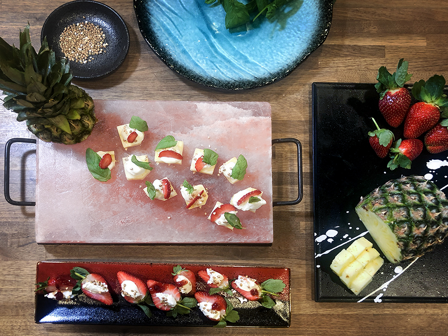 Lägg ut ananasbitarna på saltstenen och gnid dem varsamt mot stenen i några sekunder. Vänd dem och klicka på lite Philadelphia. Toppa med skivad jordgubbe, rostat bovete och ett myntablad.