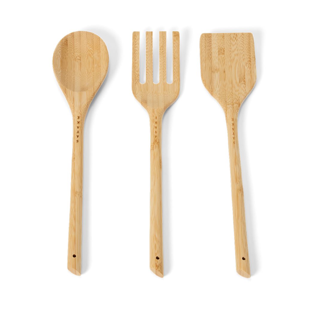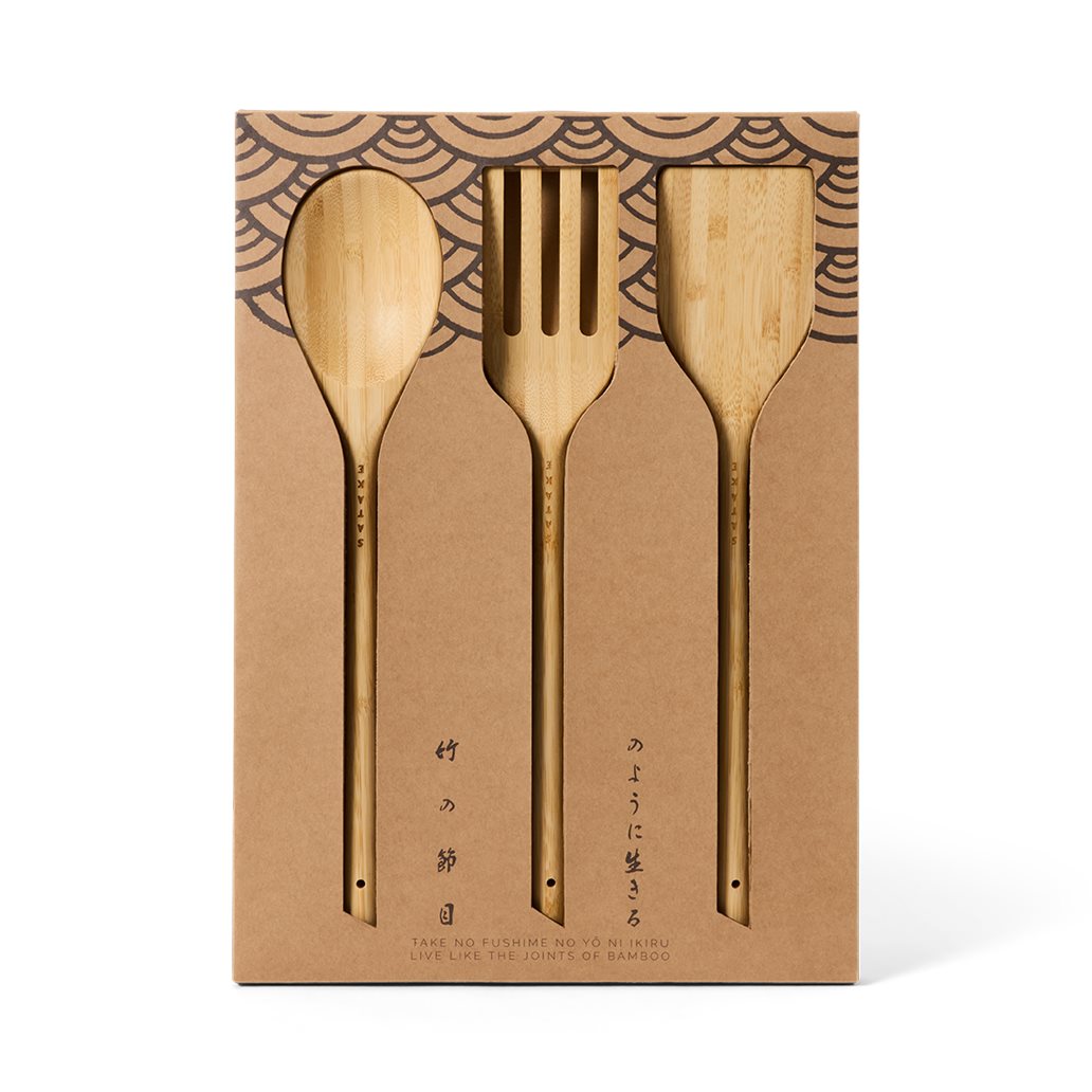 Just detta set med en serveringssked, trägaffel och en stekspade hjälper dig att presentera dina kulinariska mästerverk med elegans. Långt skaft av mjuk polerad bambu med diskret Satake logo.