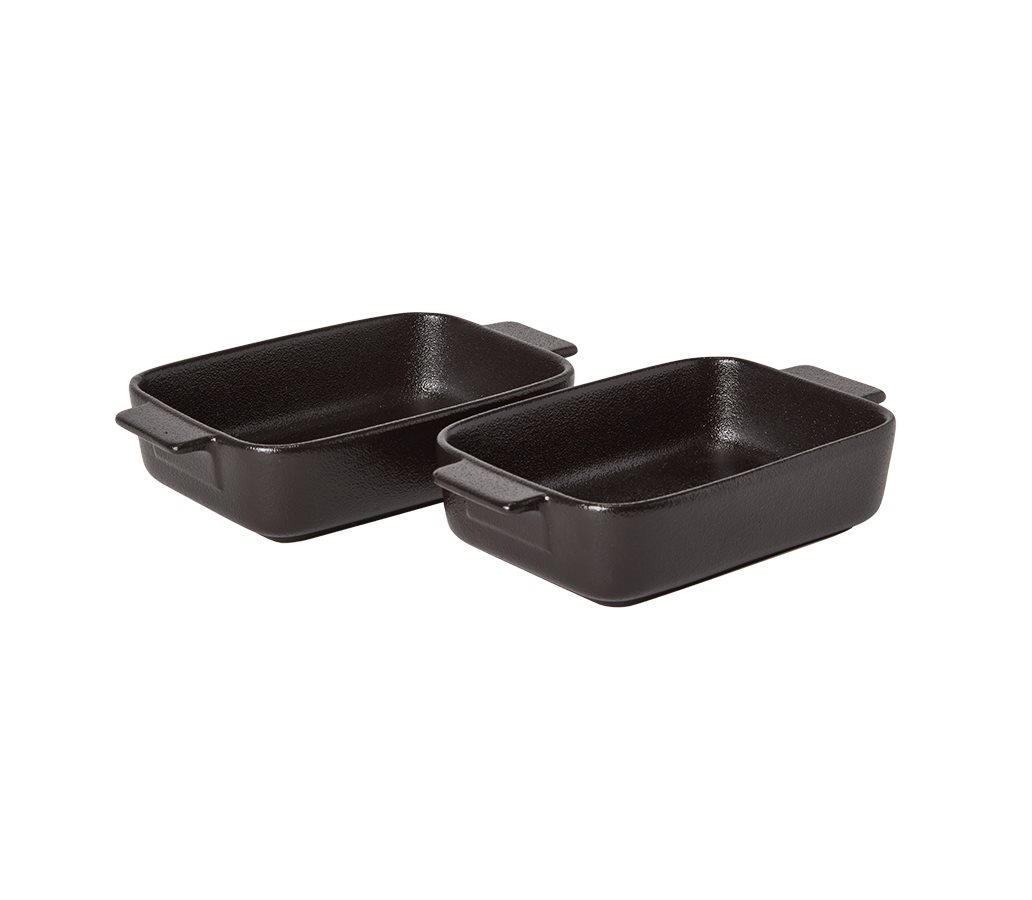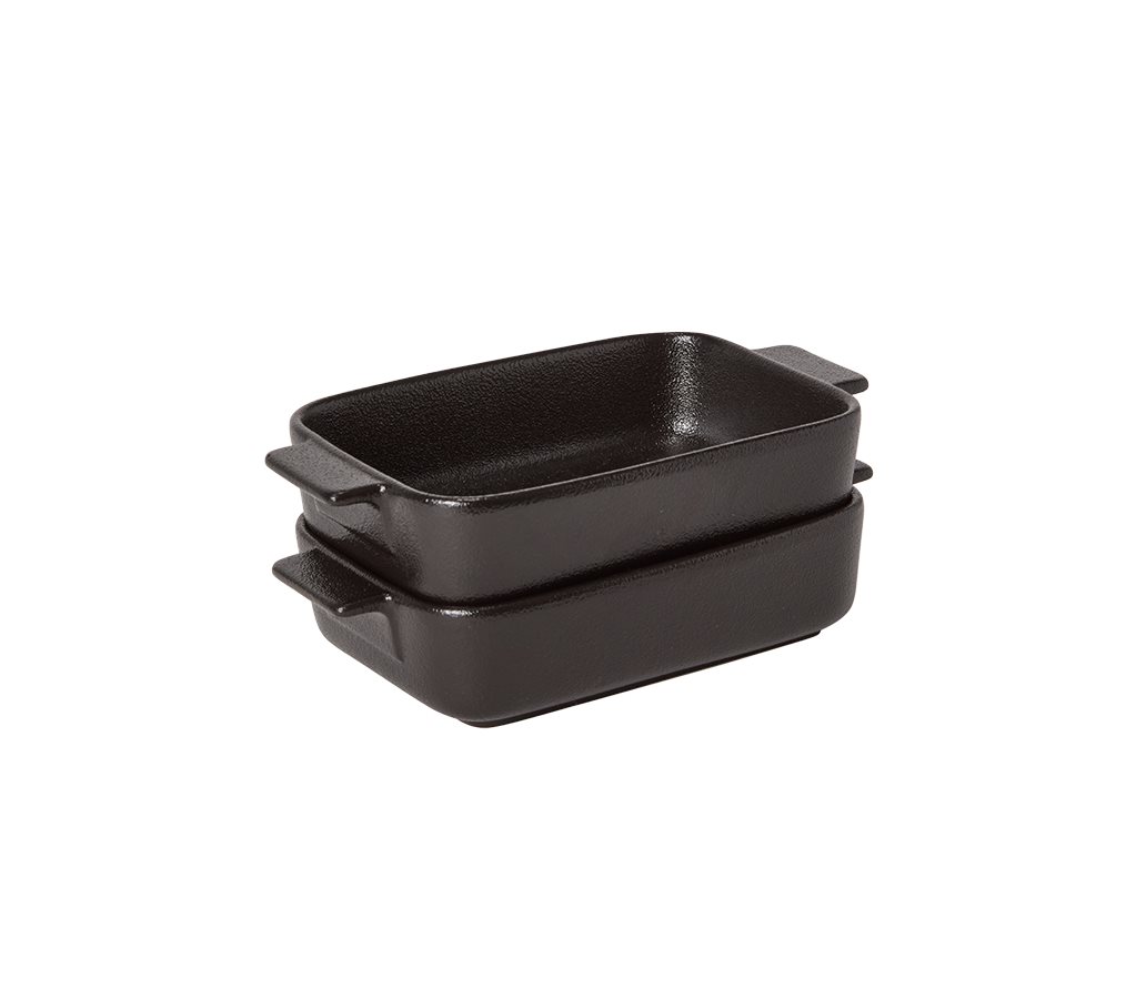 Detta 2-pack med riktigt fina små porslinsformar är inget annat än en njutning att få använda och servera i. Formarna är tillverkade av svart sprayglacerat porslin där ytan är mycket slitstark och reptålig. Formarna är ugnssäkra upp till 240°C och kan användas i microvågsugn och diskas i maskin.